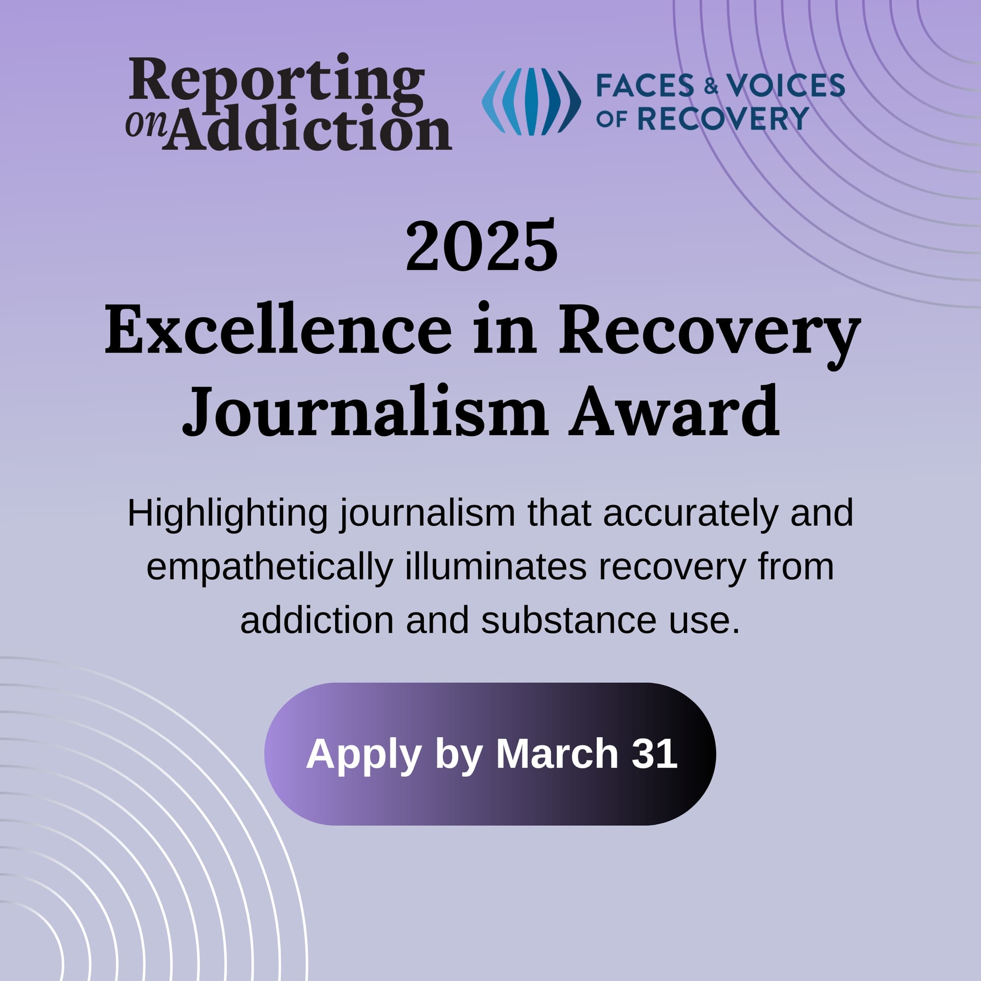 Reporting on Addiction, in partnership with Faces and Voices of Recovery, is soliciting applications for the 2025 Excellence in Recovery Journalism Award! We aim to highlight journalism that accurately and empathetically illuminates recovery from addiction and substance use.